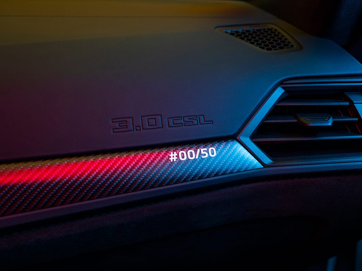 Com a bon CSL (Coupé, Sport, Lleuger), tot en ell gira entorn d’aquests tres conceptes. Bé, en quatre, doncs la línia d’estil també és molt exclusiva. En aquest sentit, el disseny de les tres bandes, vermell, blau fosc i blau clar -els tres colors originals de BMW Motorsport GmbH- continua sent el motiu principal a partir del qual gira tot el disseny. Aquesta banda tricolor aplicada en el fons blanc (Alpine White) de la carrosseria, llueix espectacular.