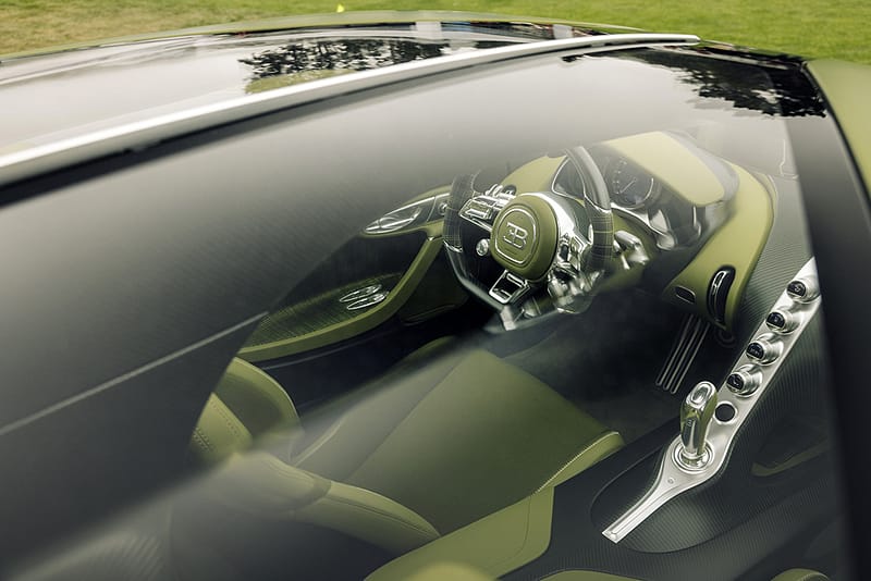 A l’interior, Bugatti ha volgut fondre tradició i futurisme: teixits amb estampat de tartà artesanal parisenc conviuen amb superfícies de fibra de carboni, tot convivint en una espectacular cúpula de vidre.