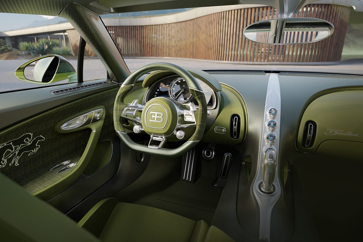 Acabat en un impactant color verd llima combinat amb negre, el model incorpora nombrosos detalls d’inspiració eqüestre, tot honorant al cavall favorit d’Ettore Bugatti, també batejat amb el nom de Brouillard.