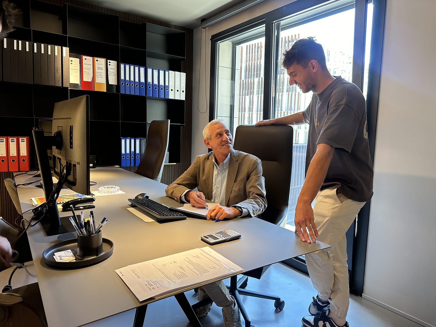 – El meu fill va ser el que va aconseguir revifar-me. Crec que quan a un pilot vocacional com jo li arriba l’hora de ser pare, una de les alegries més grans que pot tenir és que el seu fill hereti la seva mateixa passió. Recordo que des de molt petit ja mostrava interés per pilotar, tot i que va començar conduint karts. Més endavant li vam comprar una moto que duia per Vilafortuny. Un dia li va caure la moto a sobre amb la mala sort que va cremar-se la cama amb el tub d’escapament. Va ser una cremada molt forta, t’ho asseguro, però lluny de no voler saber-ne res més, tal com va recuperar-se va tornar-hi. Poc a poc va haver-hi moltes coses que m’indicaven que tenia vocació i talent pilotant.Pare i fill al despatx del primer