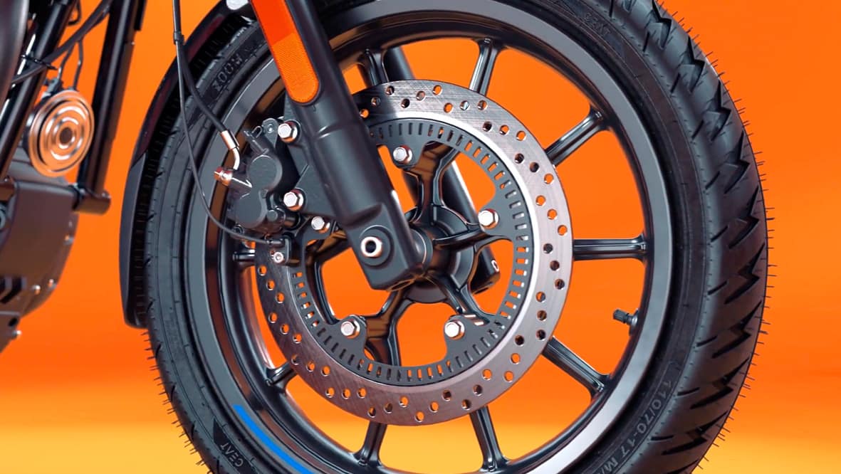 Els frens inclouen sistema ABS. Són els mateixos que munten tant la Clàssic com la Meteor. Al davant parlem d’un disc de 300 mm amb una pinça de dos pistons. Al darrere el disc és de 270 mm i porta una pinça d’un únic pistó.