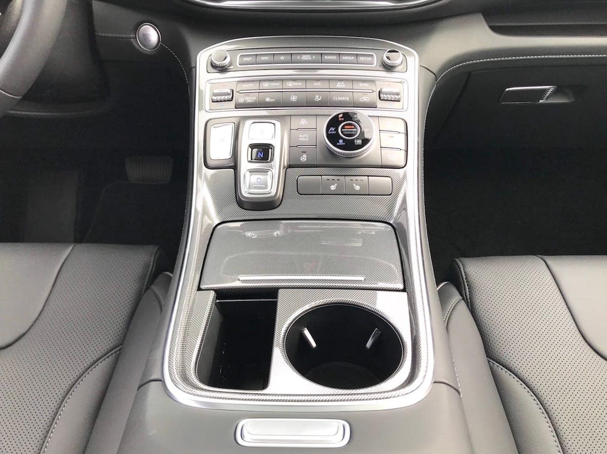 La consola central, amb un acabat que imita la fibra de carboni, reuneix els pocs botons practicables del vehicle: el d’accés al mapa, el de la navegació, els comandaments de la ràdio, el boton SETUP de configuració, el d’activació de l’aire condicionat davanter i posterior, la calefacció de seients i del volant, els botons que activen els diferents assistents a l’aparcament, la roda de selecció amb els modes de conducció, el panell amb els botons de selecció de la marxa i finalment el del fre de pàrquing electrònic.