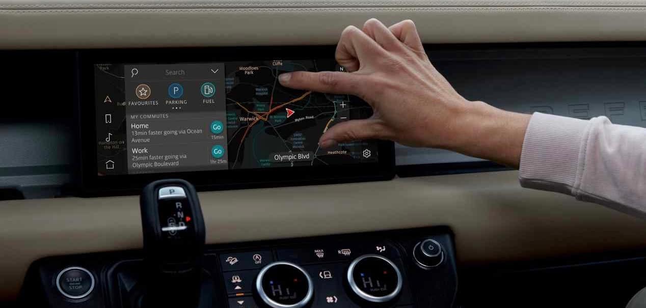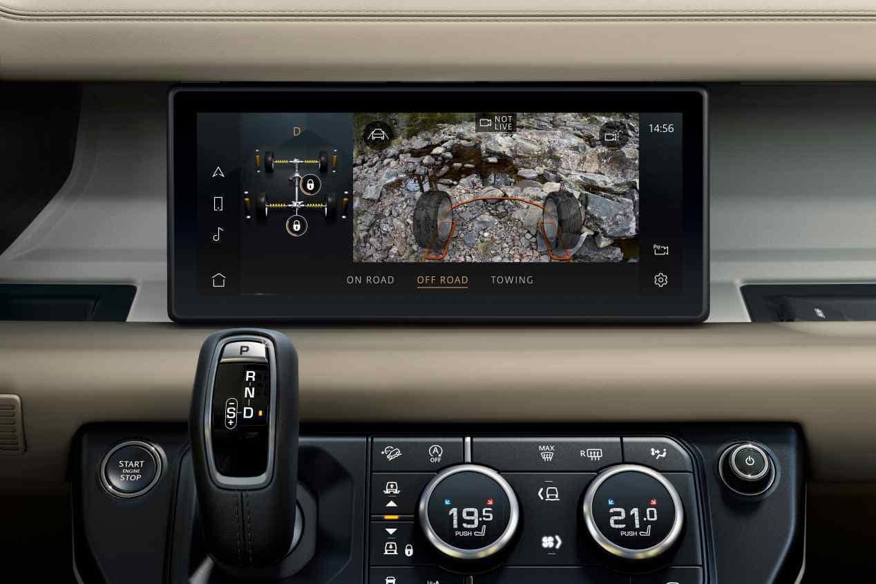 Respecte al sistema d’entreteniment i informació, el Defender presenta el «Pivi Pro». Consta d’una pantalla tàctil situada en el centre del quadre de comandament. És compatible amb Android Auto i Apple CarPlay. També inclou un sistema de recàrrega sense fils per a telèfons mòbils , cinc ports USB, sis de 12 volts, un de 230 i Bluetooth.
