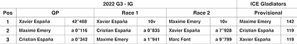 El gran protagonista de la part inicial de la G3 de les ICE Gladiators va ser Xavi España.  El seu pilotatge agressiu de sempre va tenir com a recompensa un espectacular triomf sobre Cristian, el seu germà, qui va viure una bonica lluita per la segona posició amnb Maxime Emery.