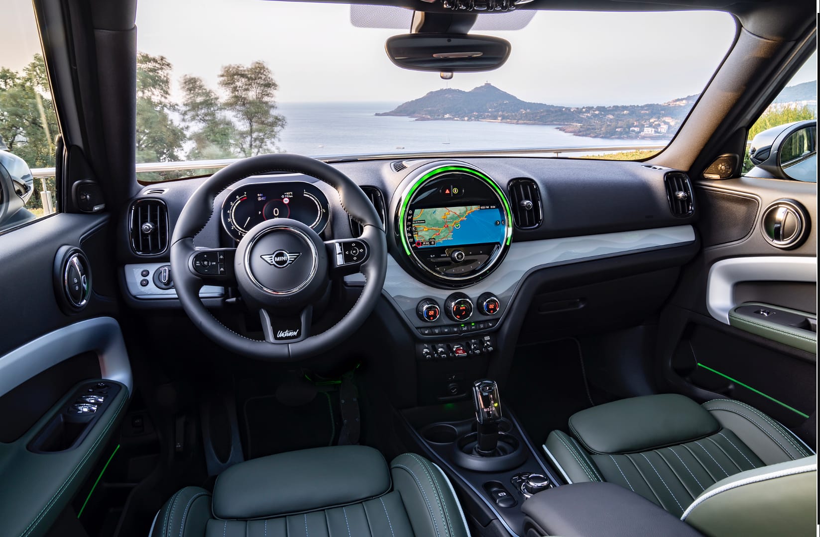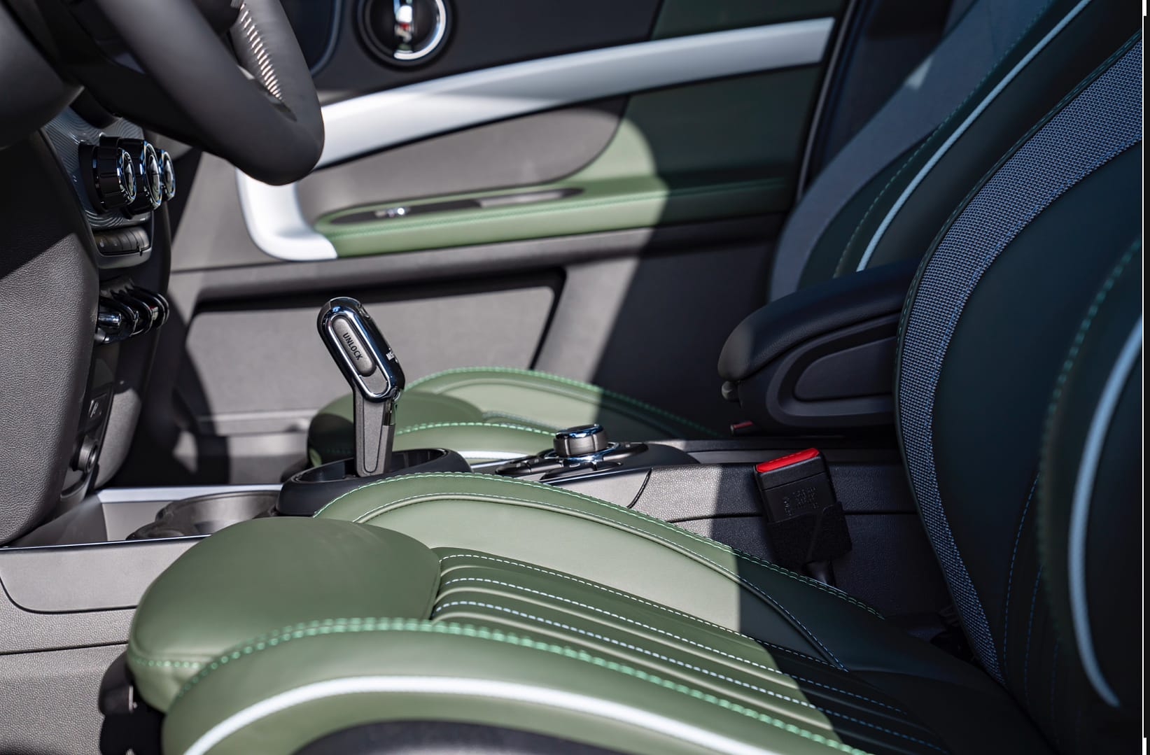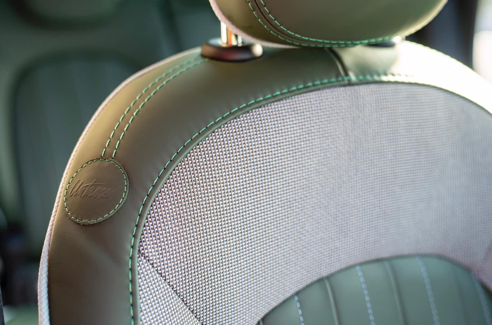 L’exclusiu color Highland Green es combina amb les costures blaves i verdes a contrast de les superfícies dels seients esportius Mini Yours Leather Lounge.