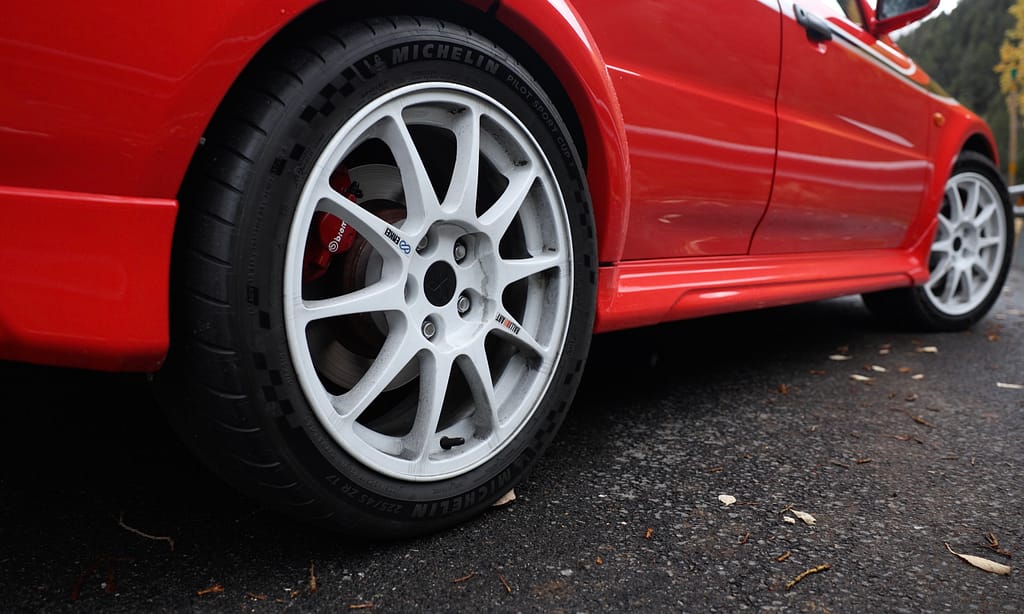 Les llandes Enkei de 17” són un altre dels elements específics del TME. Entremig dels seus 10 radis es pot veure el potent equip de frens Brembo.