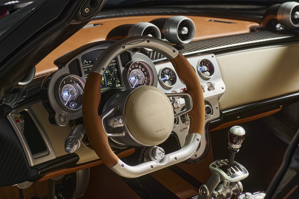 L’interior torna a ser una autèntica obra mestra de l’artesania de la factoria italiana. Miris on miris, tots els detall que guarneixen l’habitacle han estat dissenyats específicament i fabricats a mà pels millors artesans de Pagani, fent servir processos manuals, així com els millors materials, com ara cuirs de selecció per als tapissats i fibra de carboni i alumini polit per als plafons i components rígids.