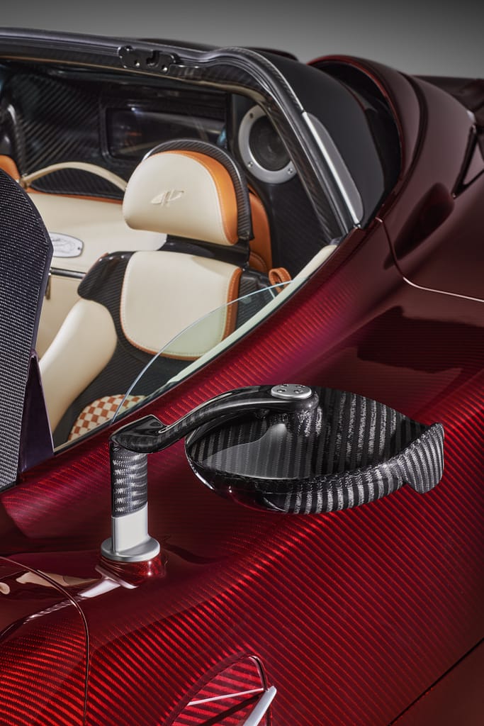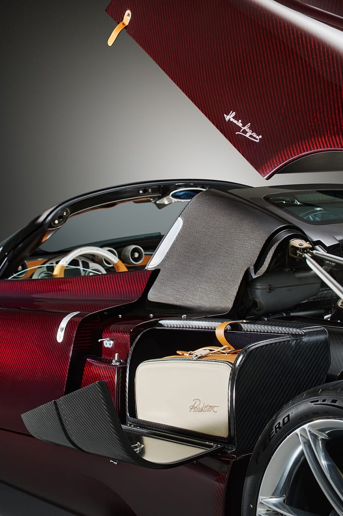 Tot i que no hi ha un maleter com a tal, el cotxe sí que inclou a cada costat, just per darrere dels dos seients, un espai concret en el que encabir la bossa de viatge de cuir que Pagani inclou amb la compra del cotxe. No és tan gran com per marxar molts dies, però bé, en aquest nivell d’exquisidesa imagino que aquest no és un cotxe amb el que fer llargs viatges. De fet, qui tingui al garatge una peça d’aquestes, segur que tindrà alguna altra més adient per viatjar!