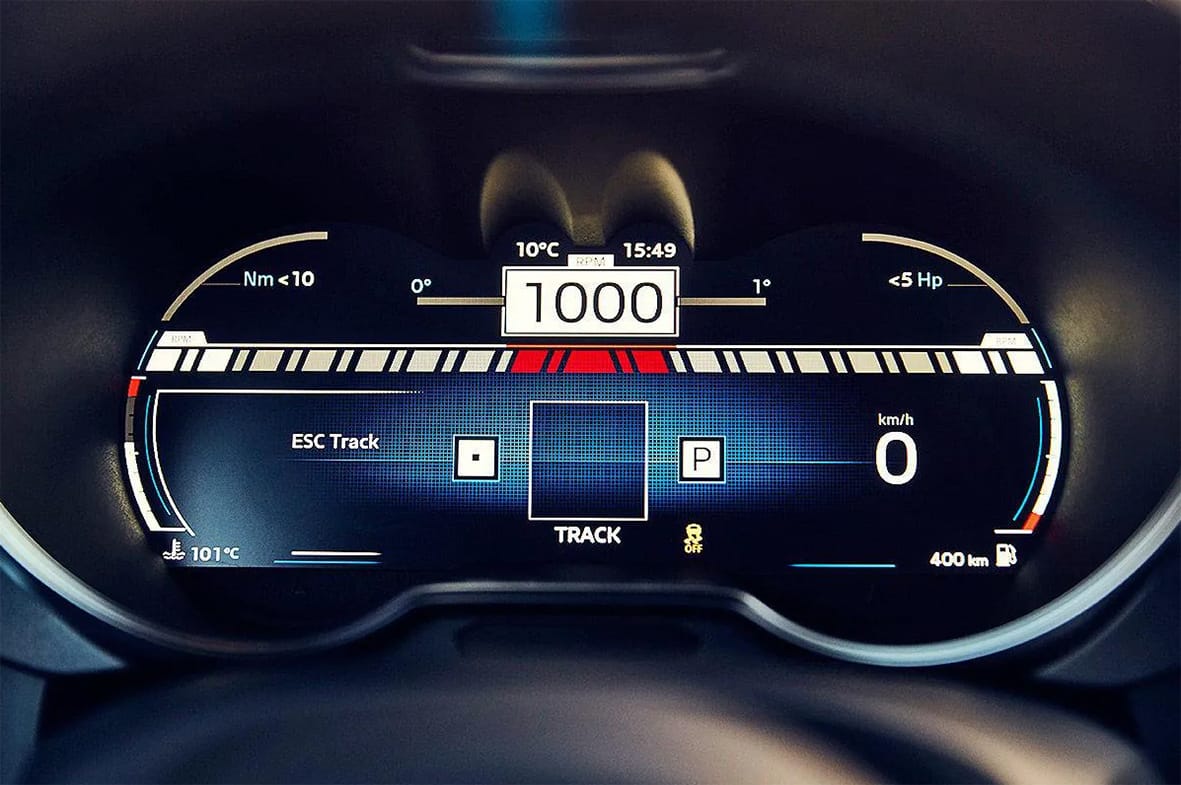 Parlant d’emocions, prement el botó Sport que hi ha al volant el cotxe passa als dos modes més esportius. Si el prems un cop passa a Sport i si el segueixes pitjant durant més temps, passa a Track. En tots dos casos el display digital canvia i mostra una visual diferent. En el mode Track però, el canvi visual és total, mostrant una pantalla amb un display molt suggerent.