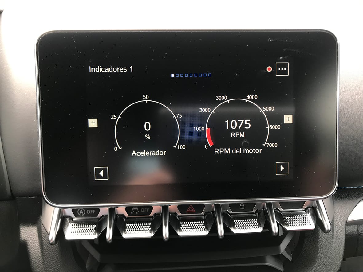 Just per sobre d’aquesta línia de botons i com a darrer element de la columna central, tenim la pantalla tàctil de 7 polzades. Ofereix una àmplia gamma de funcions multimèdia i de control. Entre altres funcions inclou la sincronització amb el telèfon mòbil via Android Auto o Apple CarPlay, navegació per satèl·lit, replicació de telèfons intel·ligents i un sistema d’entreteniment molt complert, a més de totes les pantalles informatives sobre el rendiment esportiu del cotxe.
