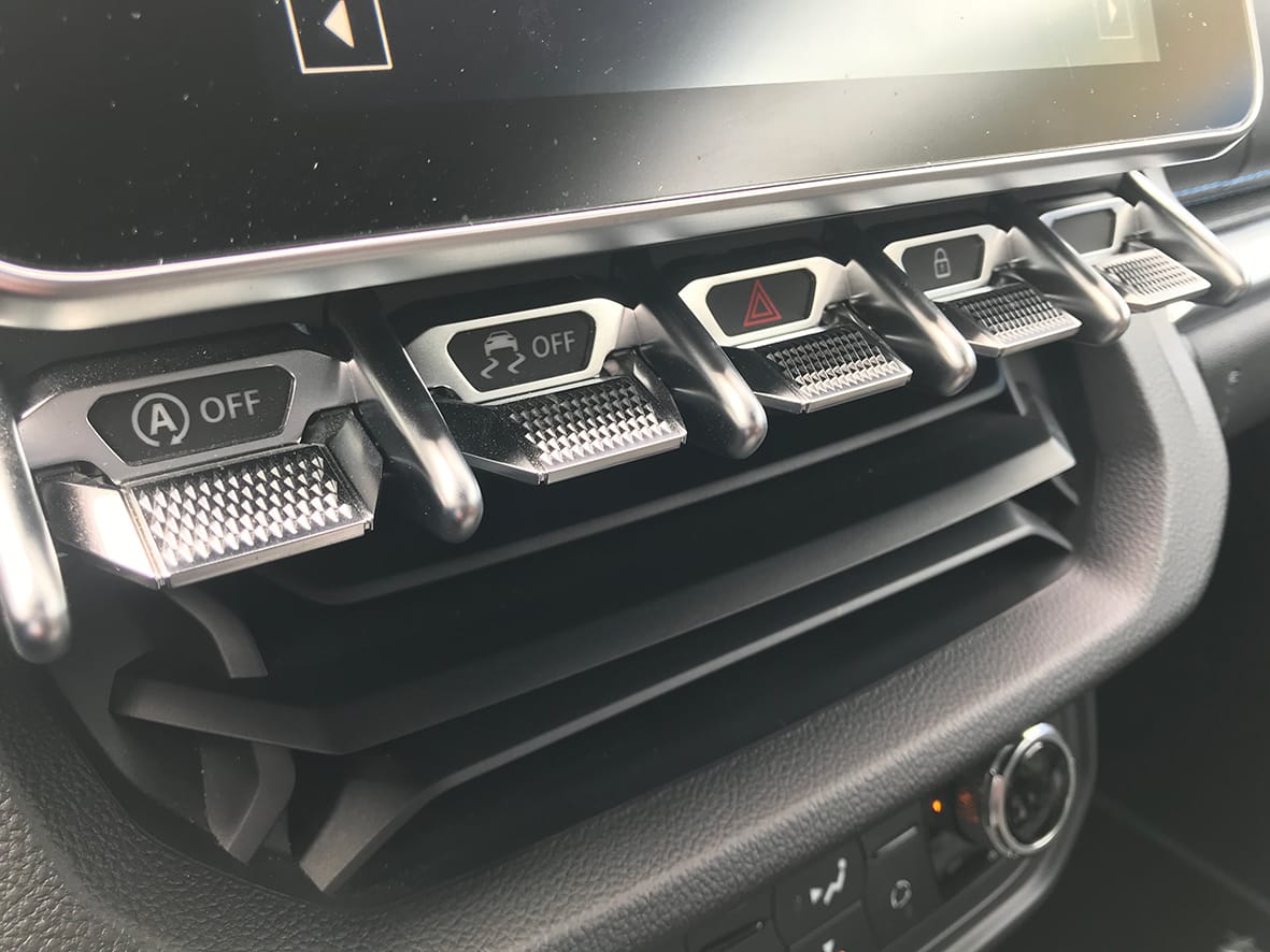 Per sobre d’aquests hi ha una segona filera de botons, en aquest cas d’alumini i amb un disseny retro molt encertat. En aquesta filera s’inclou el botó Start/Stop, el del control d’estabilitat, l’accionament dels quatre intermitents i el bloqueig de les portes.