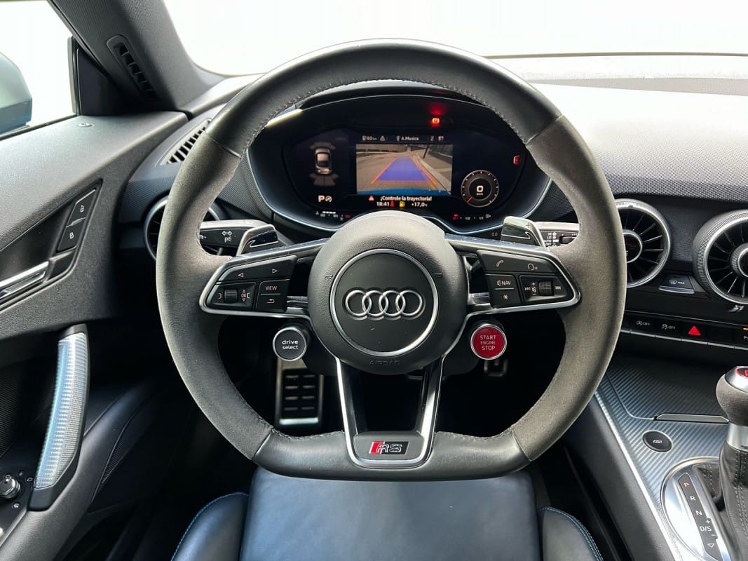 – Frens amb pinces en color vermell – Fars LED – Sistema d’escapament esportiu RS – Tren de rodatge adaptatiu amb Audi drive select – Audi virtual cockpit plus – Seients esportius tapissats en cuir negre/blau – Paquet de disseny RS plus Blau – Paquet d’òptica alumini – Insercions i superfícies d’accent en carboni gris mat – Llandes de 5 radis en alumini de 19 polzades – Protecció proactiva dels ocupants Audi pre sense basic – Clau de confort amb SAFELOCK – Retrovisors exteriors ajustables, tèrmics i abatibles elèctricament – Audi connect Navigation & Infotainment – Audi smartphone interface – Receptor de ràdio digital – Audi pre sense front – Avís de sortida de carril – Càmera de marxa enrere – Sistema de reconeixement de senyals de trànsit – Fotosensor/sensor de pluja – Carcasses de retrovisors exteriors en òptica alumini – Spoiler posterior RS – Motllures d’entrada a les vores de les portes – Volant de cuir i alcàntara contorn esportiu en disseny de 3 radis aplanat a la part inferior amb multifunció plus i paletes de canvi – Disponible a la nostra exposició – 12 mesos de garantia –