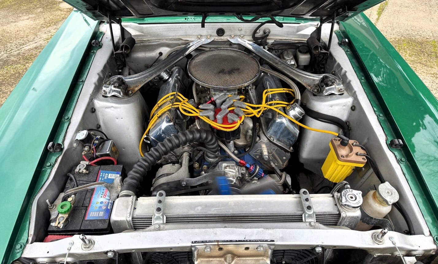 Motor V8 351 CI Cleveland amb culates d’alumini, col·lector d’admissió Edelbrock Performance, carburador Holley, col·lectors d’escapament 4 en 1 i una línia d’escapament doble de gran diàmetre (3,9 polzades). Radiador d’alumini de 28’’ amb dos kits de ventiladors de refrigeració, bomba d’aigua nova cromada, encès MSD. Potència estimada d’uns 350 CV. Rendiment molt elevat i una sonoritat demolidora: no necessitareu autoràdio.