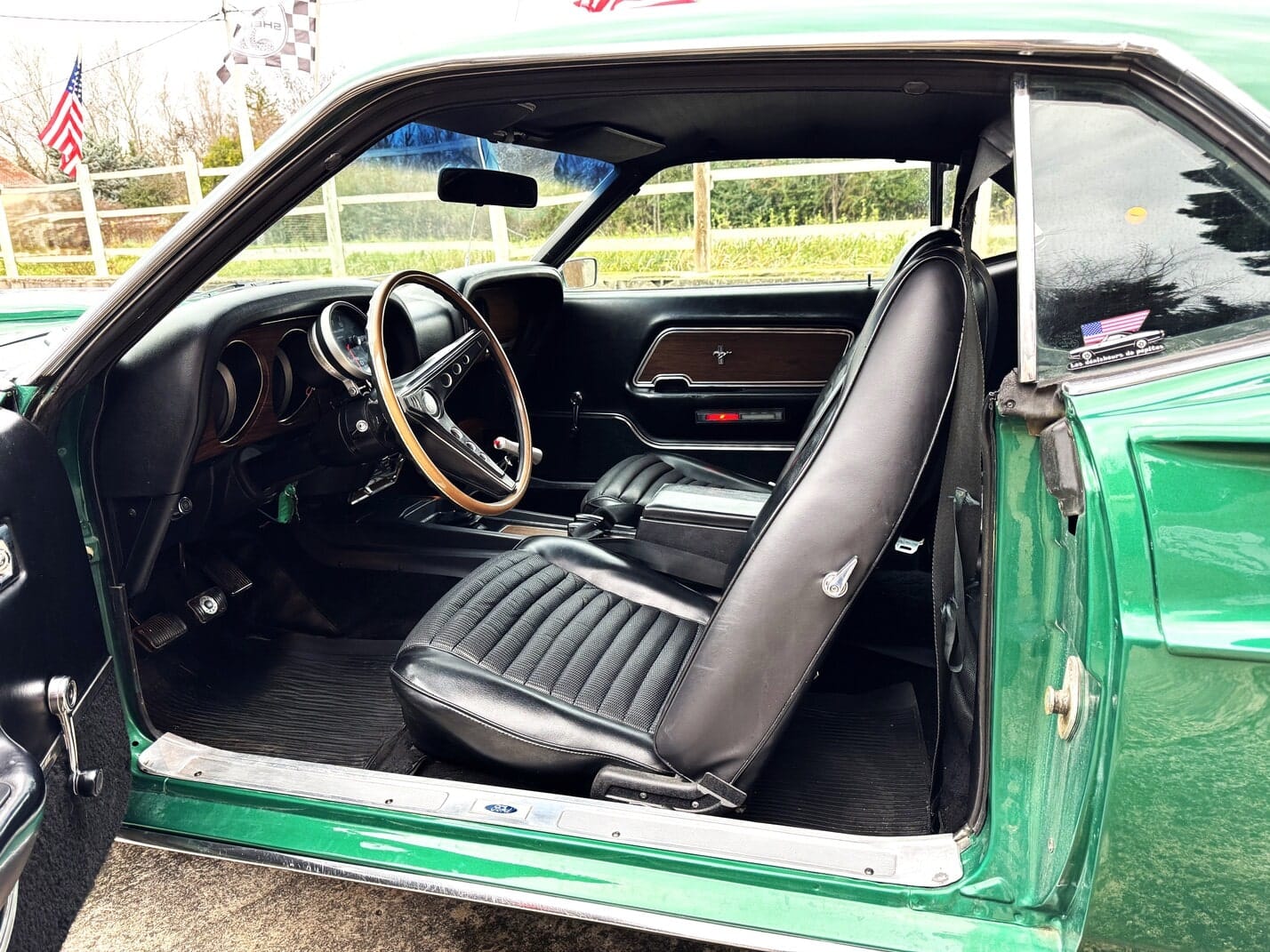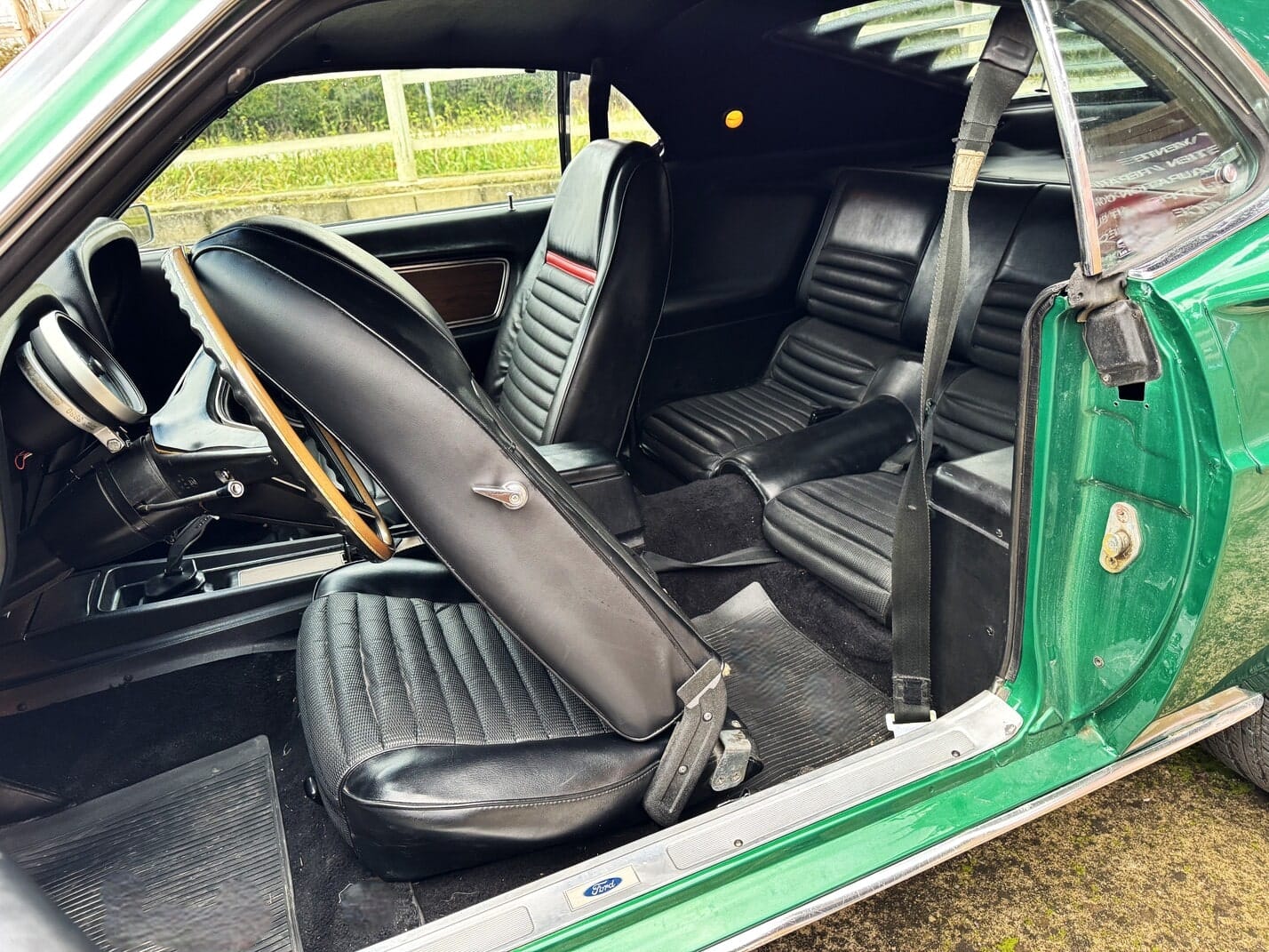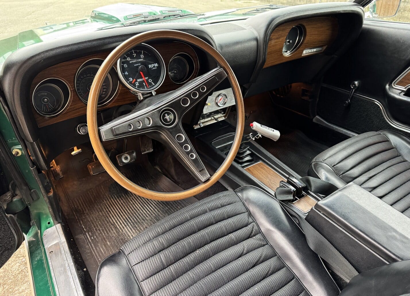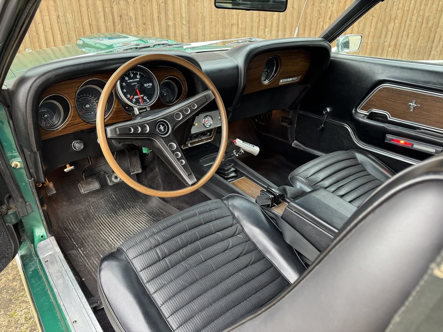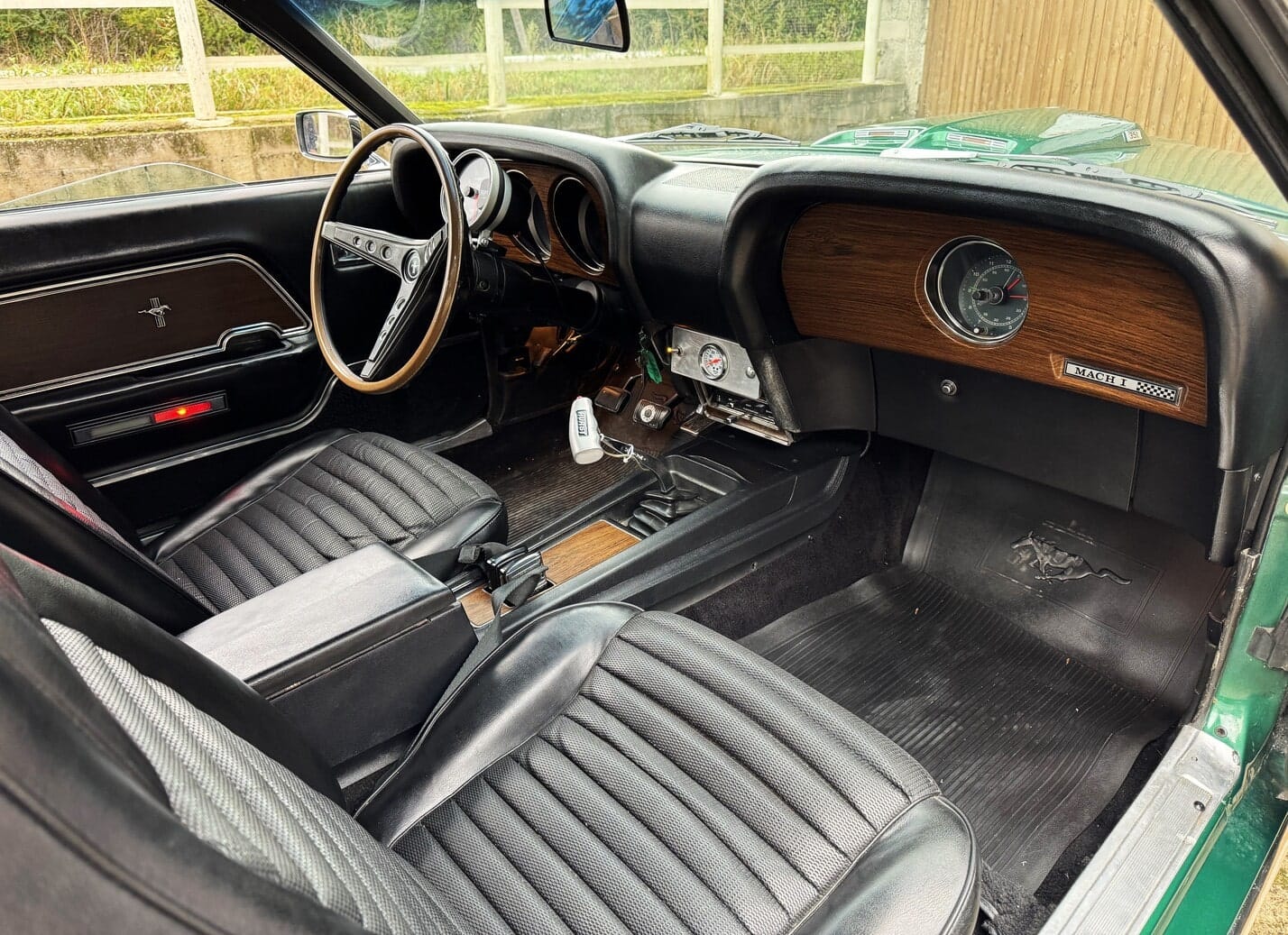 Interior en molt bon estat, amb els seients específics de la Mach One del 1969. Quadre de comandament amb acabat en fusta, també propi de la Mach 1, i compta-revolucions central opcional de grans dimensions.