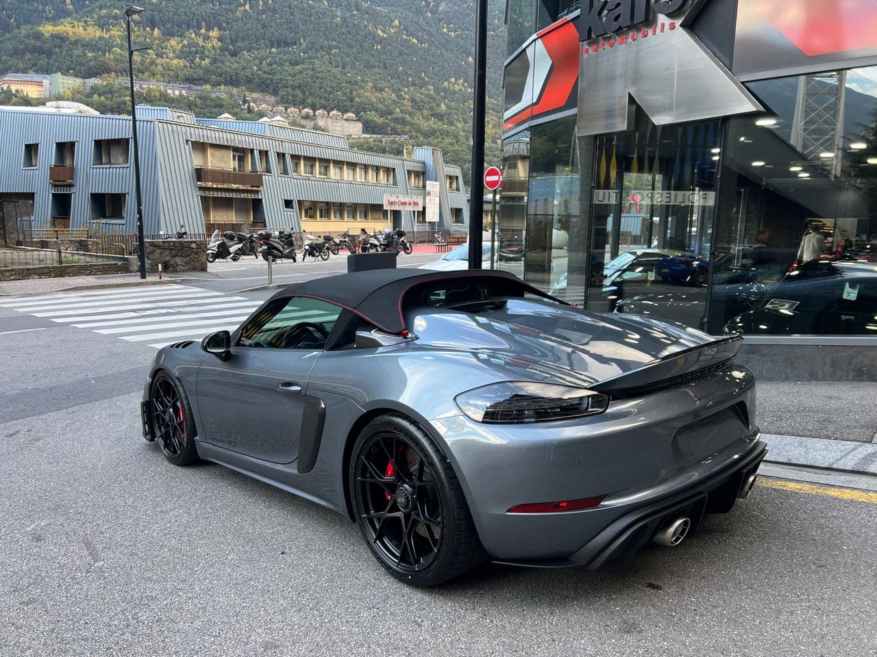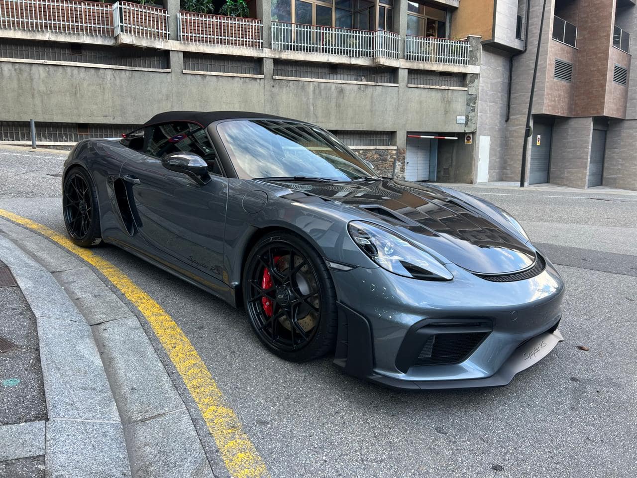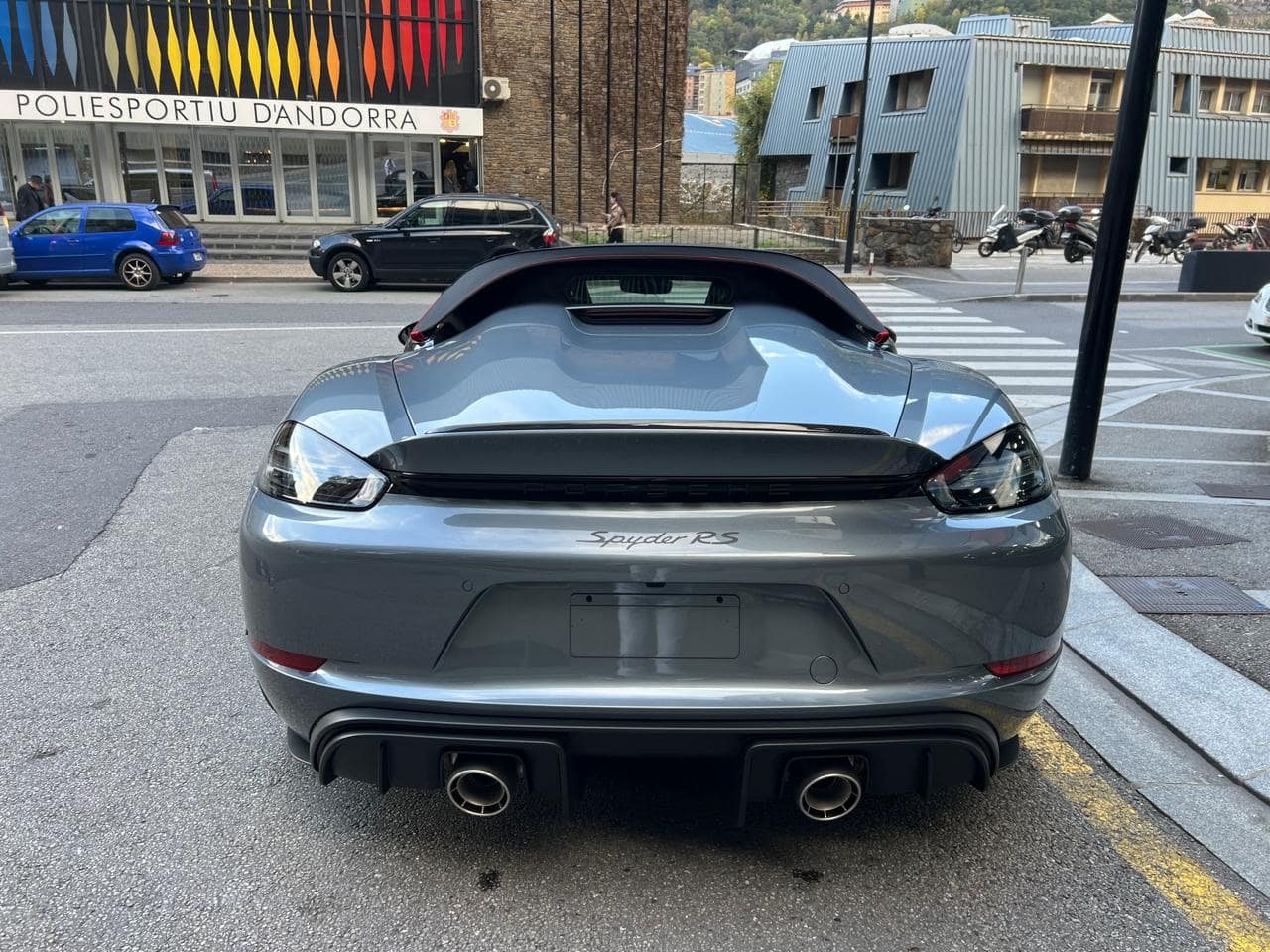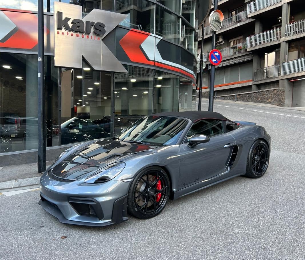 Porsche 718 Spyder RS Weissach 500CV – Color ext. Gris Vanadium Metal·litzat – Color capota Negre amb detalls Vermell Carmí – Llandes negre setinat GT4 RS 20″ – Color int. Race-Tex negre-vermell Carmí – Seients esportius adaptatius Plus elèctrics i calefactables – Paquet Weissach – Sistema elevació eix davanter – Paquet Sport Chrono – Dipòsit combustible 90L – PDK – Cinturons seguretat Vermell Guàrdia – Esferes del panell en Vermell Guàrdia – Ajuda aparcament Park Assist amb càmera marxa enrere – Control velocitat – Preparació per Dash Cam – Paquet il·luminació interior – Sistema de so BOSE – Apple CarPlay –