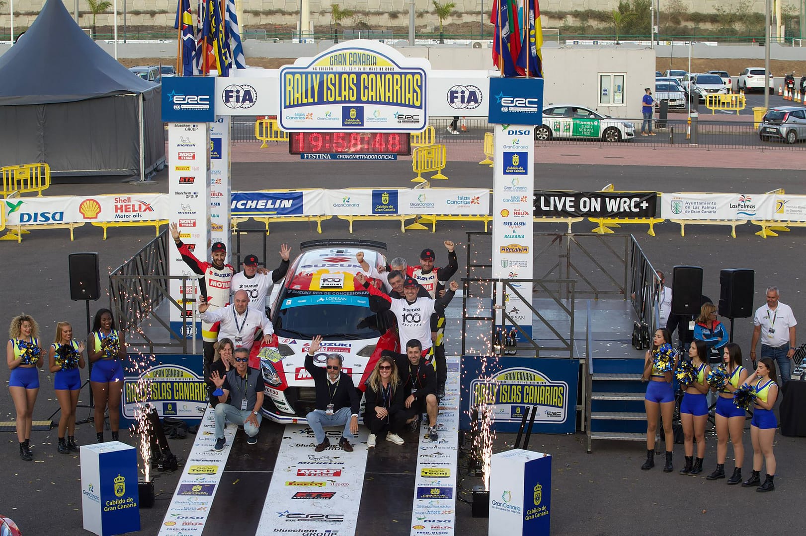 La sorpresa que els dirigents de l’equip Suzuki Ibèrica -amb Juan López Frade al capdavant- tenien reservada per a la parella, va donar-se a conèixer el dijous (dia 12). En l’assistència de l’equip es va començar a veure un bonic logo amb el número 100 i el nom dels pilots. I és que en aquesta edició 2022 del Ral·li Canàries la parella de pilots va complir 100 proves al volant d’un Suzuki.